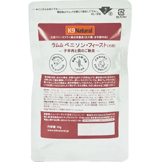 K9ナチュラル ラム&ベニソンは、ニュージーランド産のグラスフェッド・ラムをベースに、イヌ科の動物にとって1番ナチュラルと言われる鹿肉を使用した、野性味溢れる総合栄養食です。